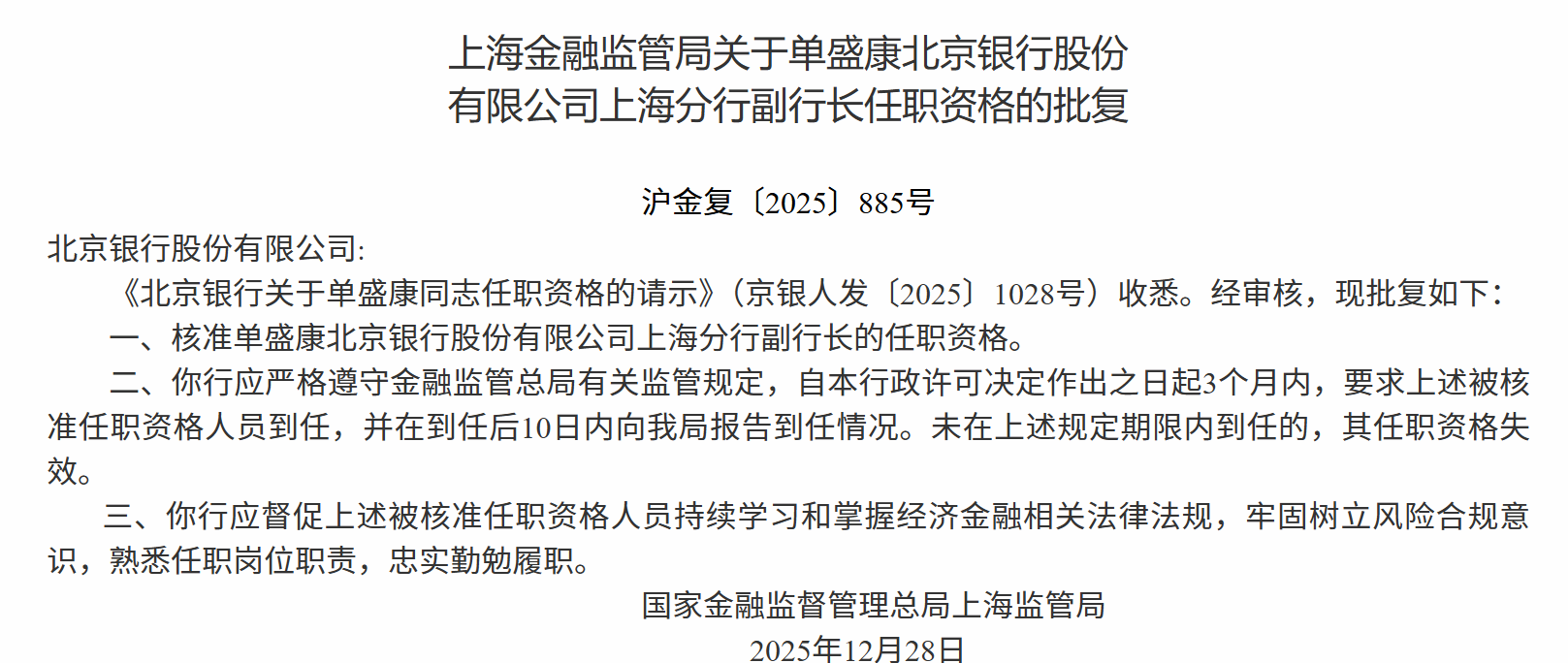 1月7日,上海金融监管局发布关于单盛康北京银行股份有限公司上海分行副行长任职资格的批复,核准单盛康北京银行股份有限公司上海分行副行长的任职资格。